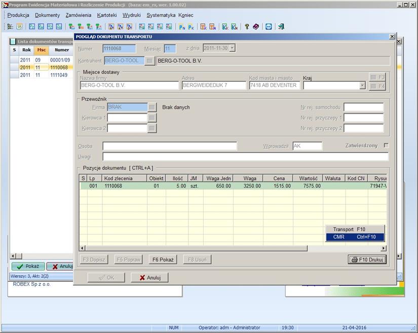 Po zakończeniu realizacji zlecenia, wykonana konstrukcja musi zostać przewieziona do kontrahenta. W celu udokumentowania transportu tworzony jest dokument transportu (list przewozowy), na którym podawane są informacje potrzebne dla służb kontrolujących transport (urzędy celne, policja, ubezpieczalnie itp.)