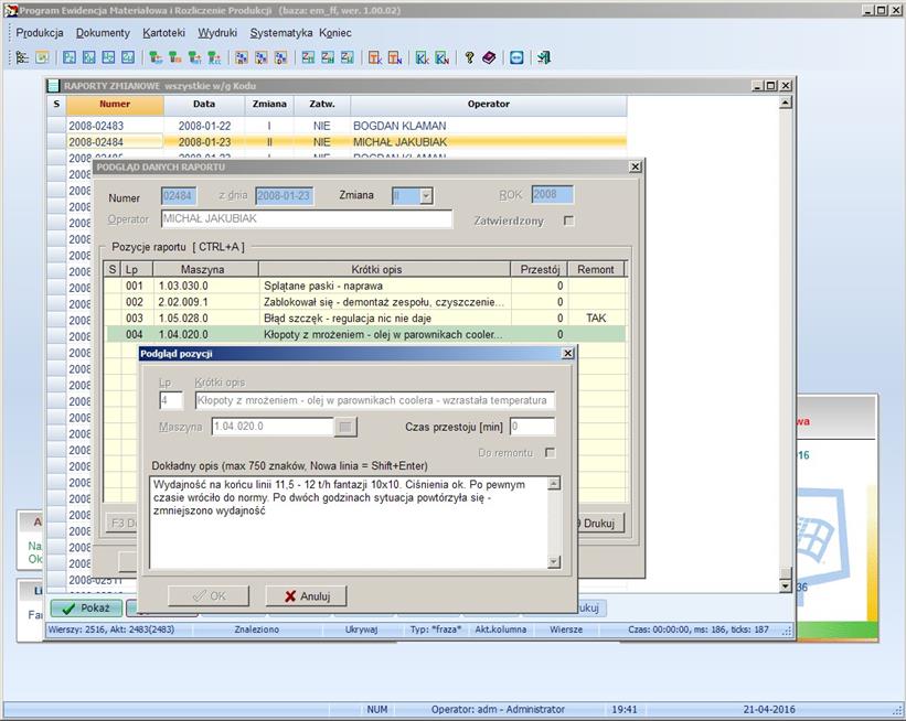 - ewidencjonowanie raportów zmianowych służb remontowych opisujących zakres prac remontowych dla danej maszyny,
