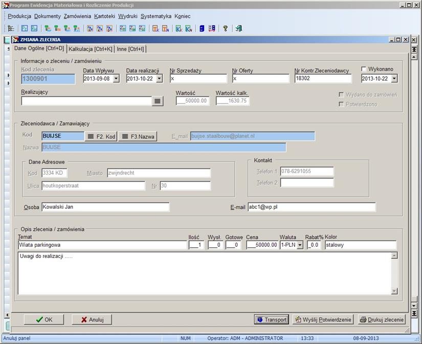 Na poniższym przykładzie przedstawione jest zlecenie ogólne na konstrukcję. Zlecenia mogą być wprowadzane do systemu przez użytkownika lub poprzez formularz wypełniany na stronie WWW przez kontrahenta. Program odczytuje wysłane ze strony WWW zamówienie, które również może dotyczyć konstrukcji specjalnych typu kontener czy zbiornik z szeregiem dodatkowych parametrów definiujących tę konstrukcję i wprowadza dane do systemu. Kontrahent wysyłający zamówienie informowany jest o wprowadzeniu jego zamówienia do systemu. Zarejestrowane zlecenie przesyłane jest na stronę WWW gdzie trafia na listę realizowanych zleceń.