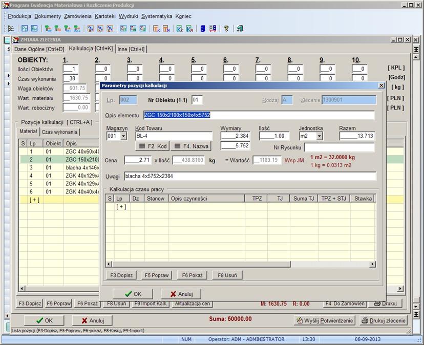 Elementem zlecenia jest kalkulacja materiału i robocizny wymaganych do jego zrealizowania.
